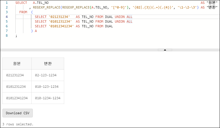 , REGEXP_REPLACE(REGEXP_REPLACE(A.TEL_NO, '[^0-9]'), '(02|.{3})(.+)(.{4})', '\1-\2-\3') AS "변환"