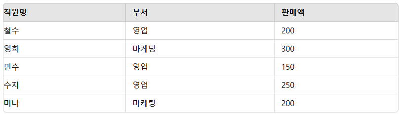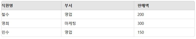 영업 부서의 총 판매액을 구하려면 다음과 같이 입력합니다: