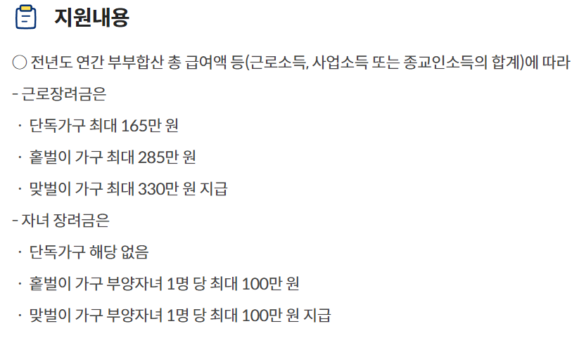 신청요건을 모두 충족하는 근로소득, 사업소득 또는 종교인소득이 있는 가구로써 신청기간 내 신청하는 경우 근로소득, 사업소득 또는 종교인소득에 따라 산정한 근로장려금과 부양자녀수에 따라 산정한 자녀장려금을 지급